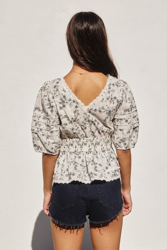Lace Trim Smocked Waist Peplum Top